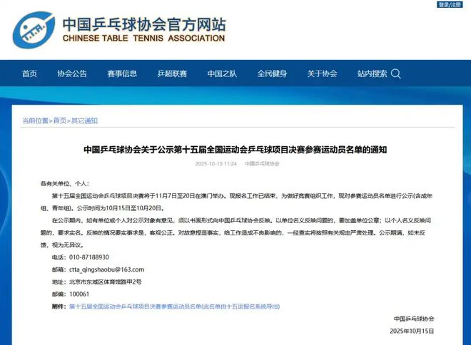 北京时间10月15日,第十五届全国运动会乒乓球项目决赛参赛运动员名单公布。名单囊括了国内所有顶尖选手,马龙、樊振东、王楚钦、孙颖莎、陈梦等主力队员悉数在列。这场11月7日将在澳门开赛的 “乒乓球地表最强赛事”,已然提前点燃了期待。