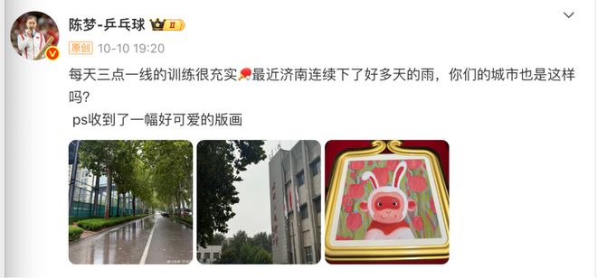 女队赛场上,陈梦自巴黎奥运会后,便阔别职业赛场,唯一一次参赛是与马龙一起参加去年12月份举行的“老瓦杯”友谊赛。今年7月接受杂志采访谈到全运会的话题,陈梦坦言已有半年没有正规训练,“自己也是很期待回到省队,跟大家一起同吃同住,回到训练场跟大家一起努力,然后在比赛场上展现最好的自己。再一次站到赛场上,我觉得无论结果怎样,最主要的是专注过程。”几天前,陈梦在社交媒体上还晒出了自己的训练日常,并写道:“每天三点一线的训练很充实。”